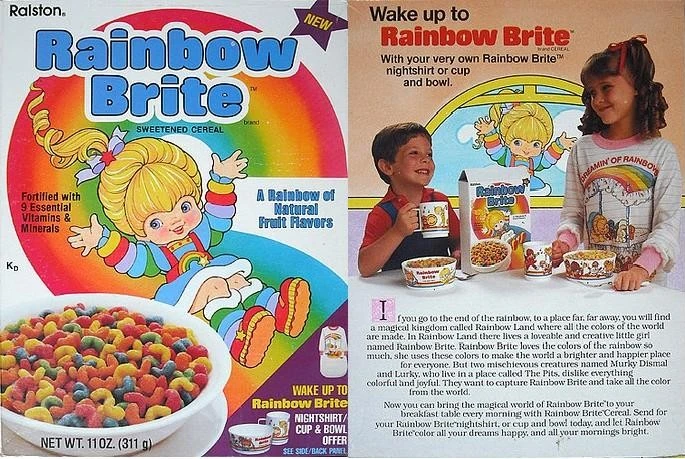 "Now you can bring the magical world of Rainbow Brite to your breakfast table every morning with Rainbow Brite Cereal... let Rainbow Brite color all your dreams happy, and your mornings bright."